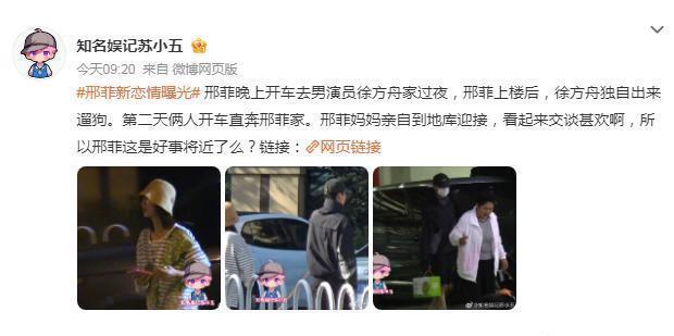 2025年11月4日,多家娱乐媒体(如"知名娱记苏小五")爆料称,邢菲被拍到深夜独自驾车前往徐方舟住所过夜;次日两人同乘返回邢菲住处时,邢菲母亲亲自到地库迎接,三人互动自然熟络,被推测关系稳定且已获家庭认可。