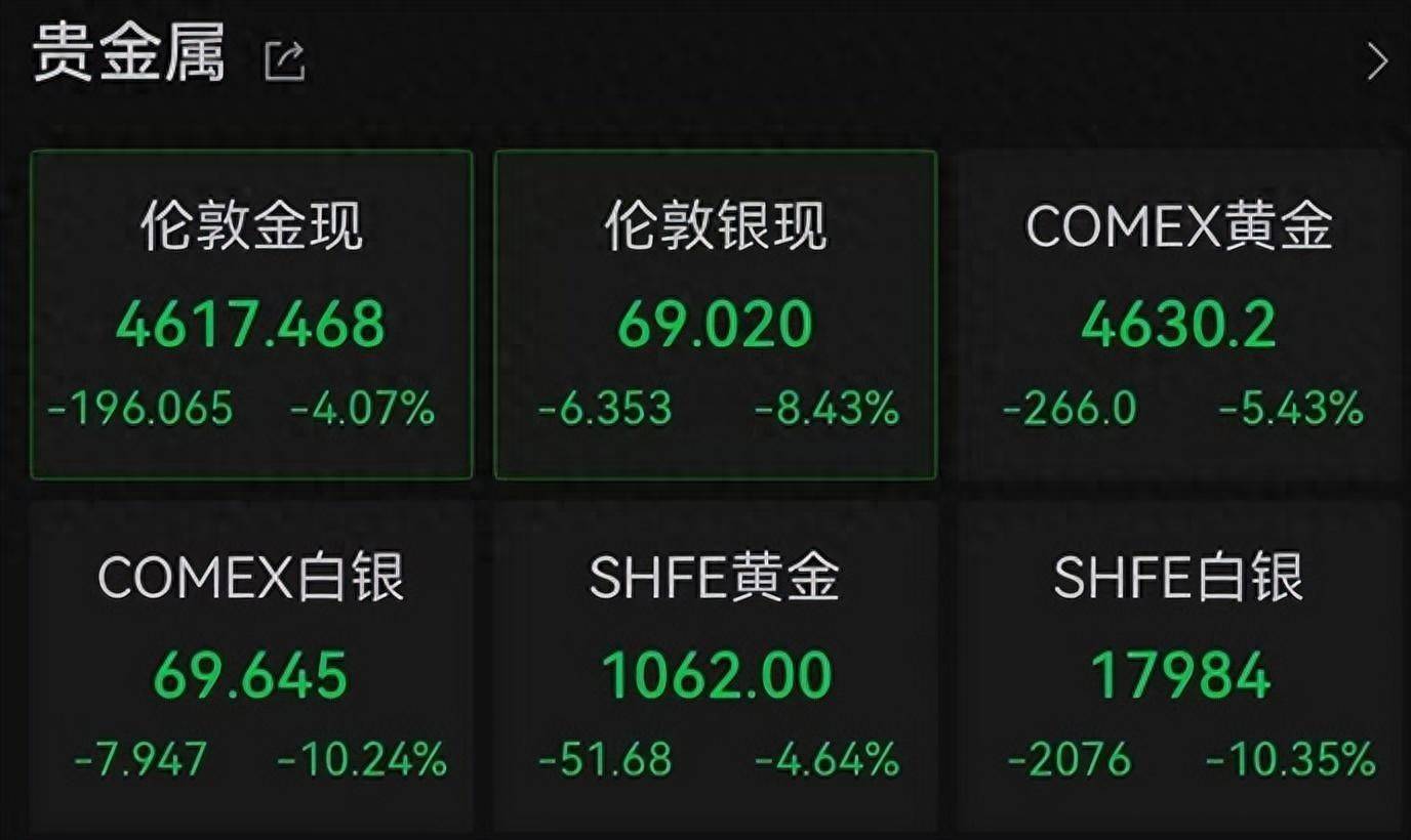 截至发稿,现货黄金日内跌幅扩大至4.07%,报4617.46美元/盎司。现货白银日内跌幅扩大至8.43%,报69.02美元/盎司。