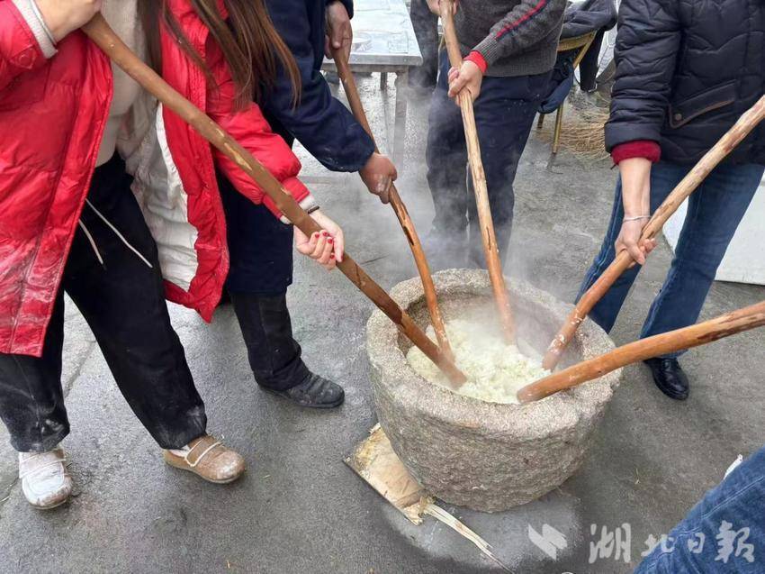 打糍粑这一传统民俗不仅是舌尖上的美味传承,更是维系乡情、召唤游子的精神纽带。在麻城,打糍粑是辞旧迎新的“重头戏”,这一习俗跨越数百载光阴从未中断。“平时大家天各一方务工谋生,只有打糍粑能把全村人凑齐,聊聊近况、叙叙旧情,感情就不会淡。”老人感慨的话语道出了民俗背后的深意。老人们围坐闲话往昔岁月,年轻人主动学习捶打技巧,孩子们穿梭追逐争抢热糍粑,这场集体劳作让分散的亲情重新汇聚,让淡去的乡情再度浓厚。